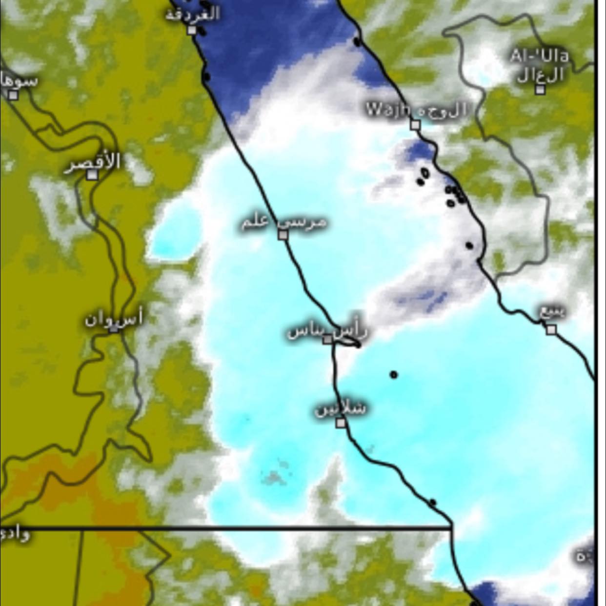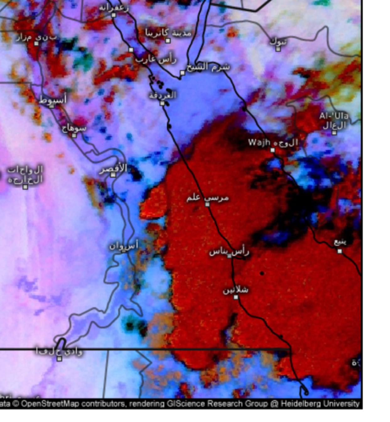 نشرت الهيئة العامة للأرصاد الجوية، صورًا للأقمار الصناعية، ترصد استمرار تكاثر السحب الرعدية الممطرة على سلاسل جبال البحر الأحمر، تحديدًا على مناطق (حلايب - شلاتين - مرسى علم)، وأيضا على المناطق الشرقية من أقصى جنوب البلاد فى الصحراء الشرقية.