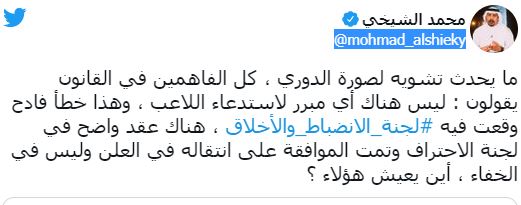 وكتب الإعلامي الرياضي محمد الشيخي عبر حسابه الرسمي على “تويتر”: “ما يحدث تشويه لصورة الدوري، كل الفاهمين في القانون يقولون ليس هناك أي مبرر لاستدعاء اللاعب، وهذا خطأ فادح وقعت فيه لجنة الانضباط والأخلاق، هناك عقد واضح في لجنة الاحتراف وتمت الموافقة على انتقاله في العلن وليس في الخفاء، أين يعيش هؤلاء؟”.