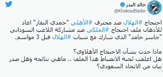 فيما قال الإعلامي الرياضي، خالد البدر، عبر حسابه الشخصي على مواقع التواصل الاجتماعي تويتر قائلاً: ”احتجاج الهلال ضد محترف الأهلي حمدي النقاز اعاد للأذهان ملف احتجاج الملكي ضد مشاركة اللاعب السوداني جاسر حامد الذي شارك مع شباب الهلال قبل 3 مواسم”.