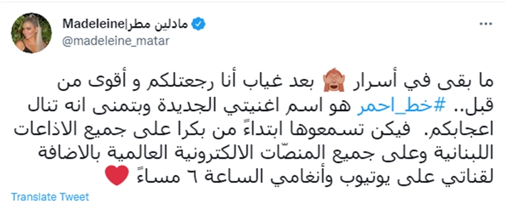 وقالت مادلين مطر “ما بقى في أسرار بعد غياب أنا رجعتلكم وأقوى من قبل.. خط أحمر هو اسم اغنيتي الجديدة وبتمنى انه تنال اعجابكم. فيكن تسمعوها ابتداءً من بكرا على جميع الاذاعات اللبنانية وعلى جميع المنصّات الالكترونية العالمية بالاضافة لقناتي على يوتيوب وأنغامي الساعة 6 مساءً”.