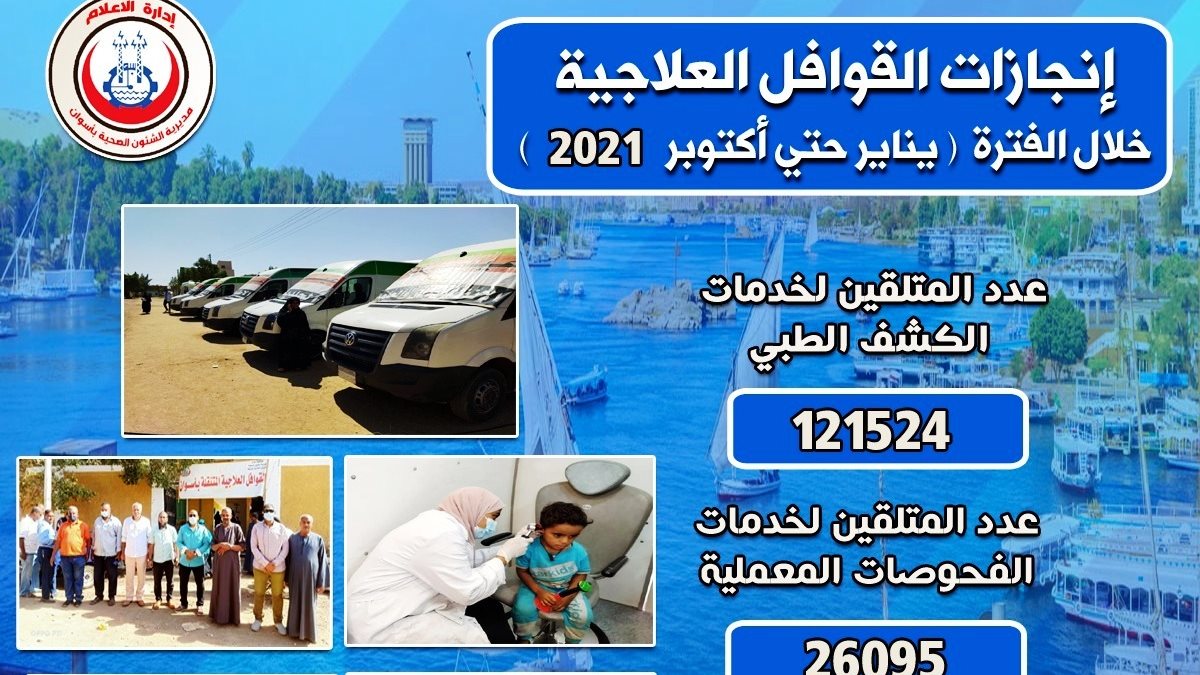 فيما أوضح الدكتور إيهاب عماد حنفي وكيل وزارة الصحة بأسوان بأن هذه القوافل الطبية نجحت فى توقيع الكشف الطبي المجانى على١٢١ ألف و ٤٢٥ مواطن ومواطنة، بجانب تقديم التحاليل والفحوصات المعملية لـ 26 ألف و 95 مواطن ومواطنة ، بالإضافة إلى تنظيم الندوات التوعوية وخدمات التثقيف الصحى والتي إستهدفت 23 ألف و 299 مواطن ومواطنة ، لافتاً إلى إستمرار تنظيم القوافل الصحية برعاية محافظ أسوان ، وبإشراف من الدكتور طارق صبيح منسق القوافل العلاجية المتنقلة وذلك للمساهمة فى التخفيف عن كاهل المرضى ، ولاسيما الأكثر إحتياجاً ، وتقديم الخدمات الصحية المتنوعة لهم بأعلى جودة ممكنة .