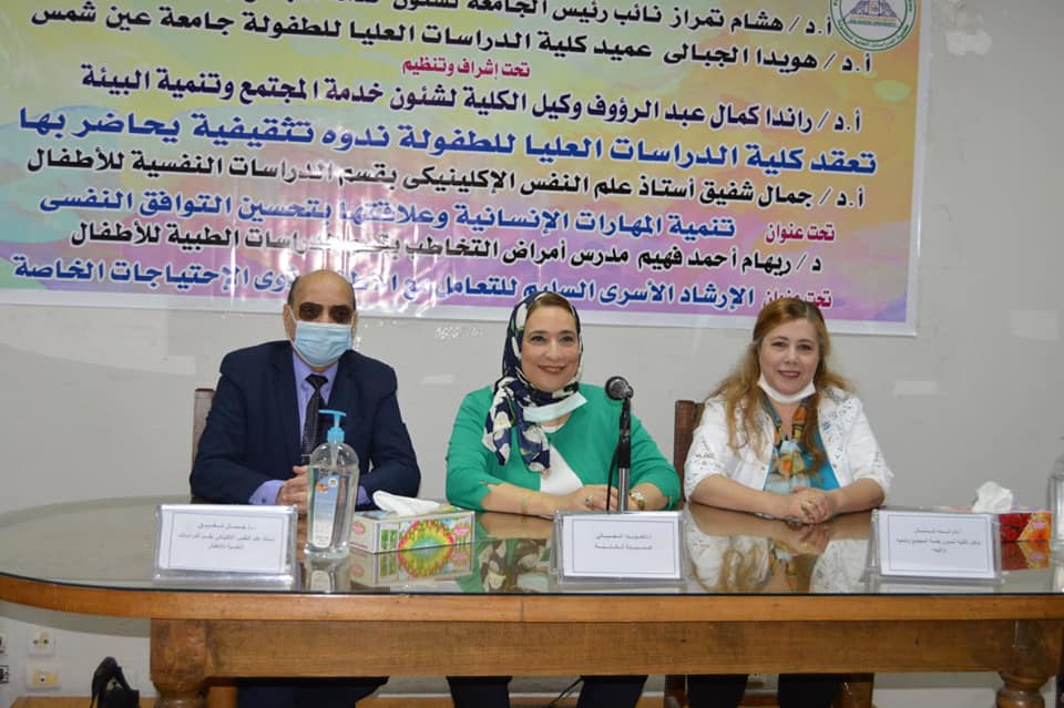 أقيمت كلية الدراسات العاليا للطفولة بجامعة عين شمس ندوة " الإرشاد الأسرى السليم للتعامل مع الاطفال ذوى الاحتياجات الخاصة " تحت رعايه ا.د. محمود المتيني رئيس جامعة عين شمس و ا.د. هشام تمراز نائب رئيس الجامعة لشئون خدمه المجتمع وتنميةا.د/ هويدا الجبالي عميد كلية الدراسات العليا للطفوله تحت اشراف وتنظيم ا.د. راندا كمال وكيل الكلية لشئون خدمة المجتمع وتنمية .