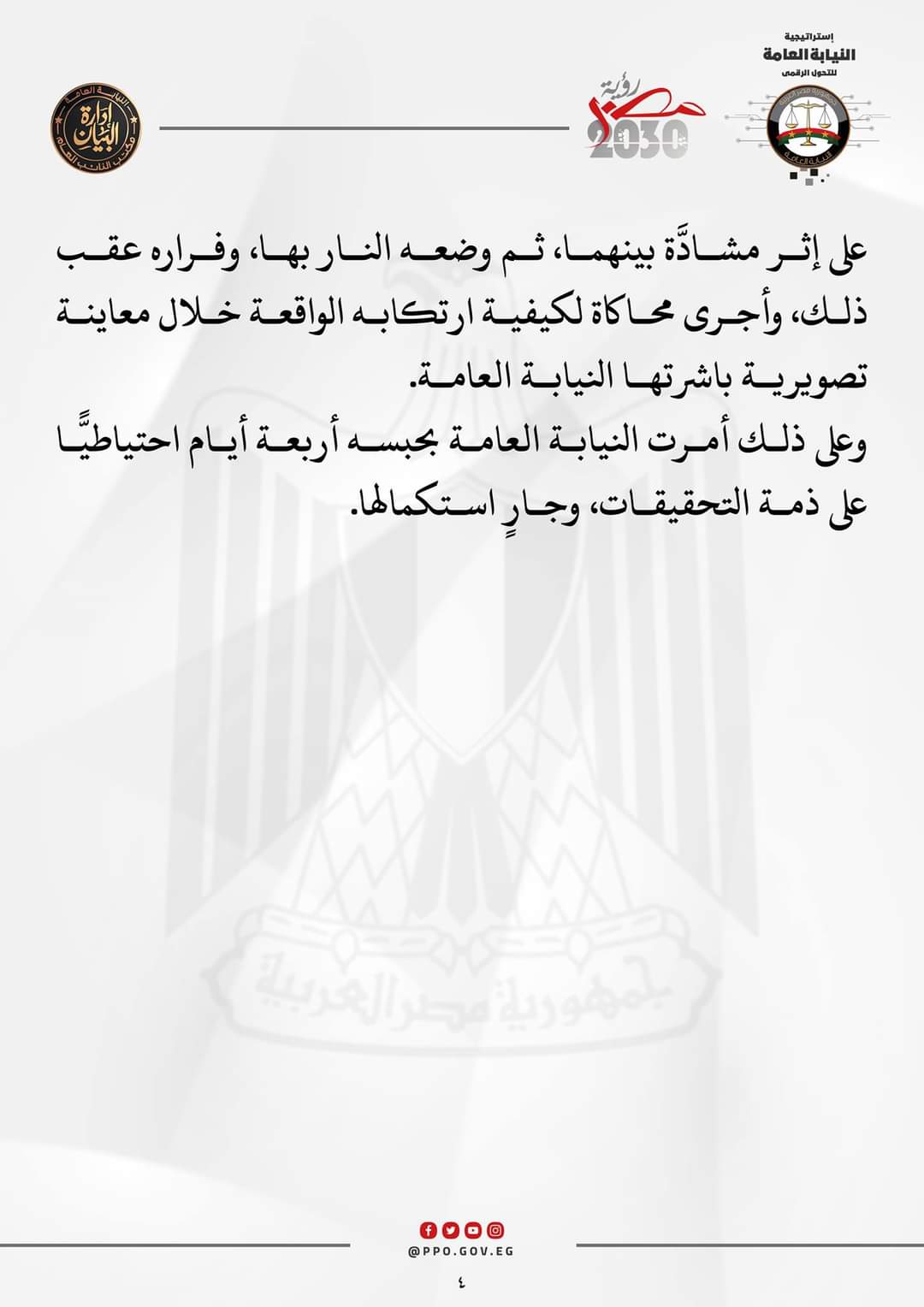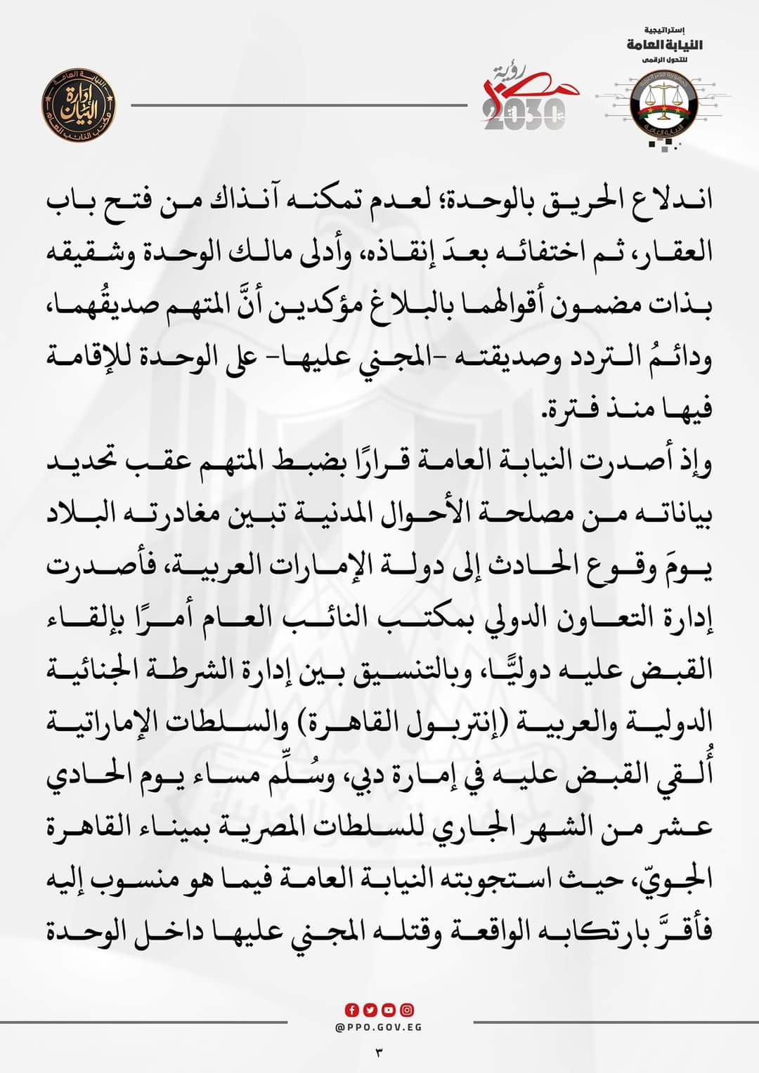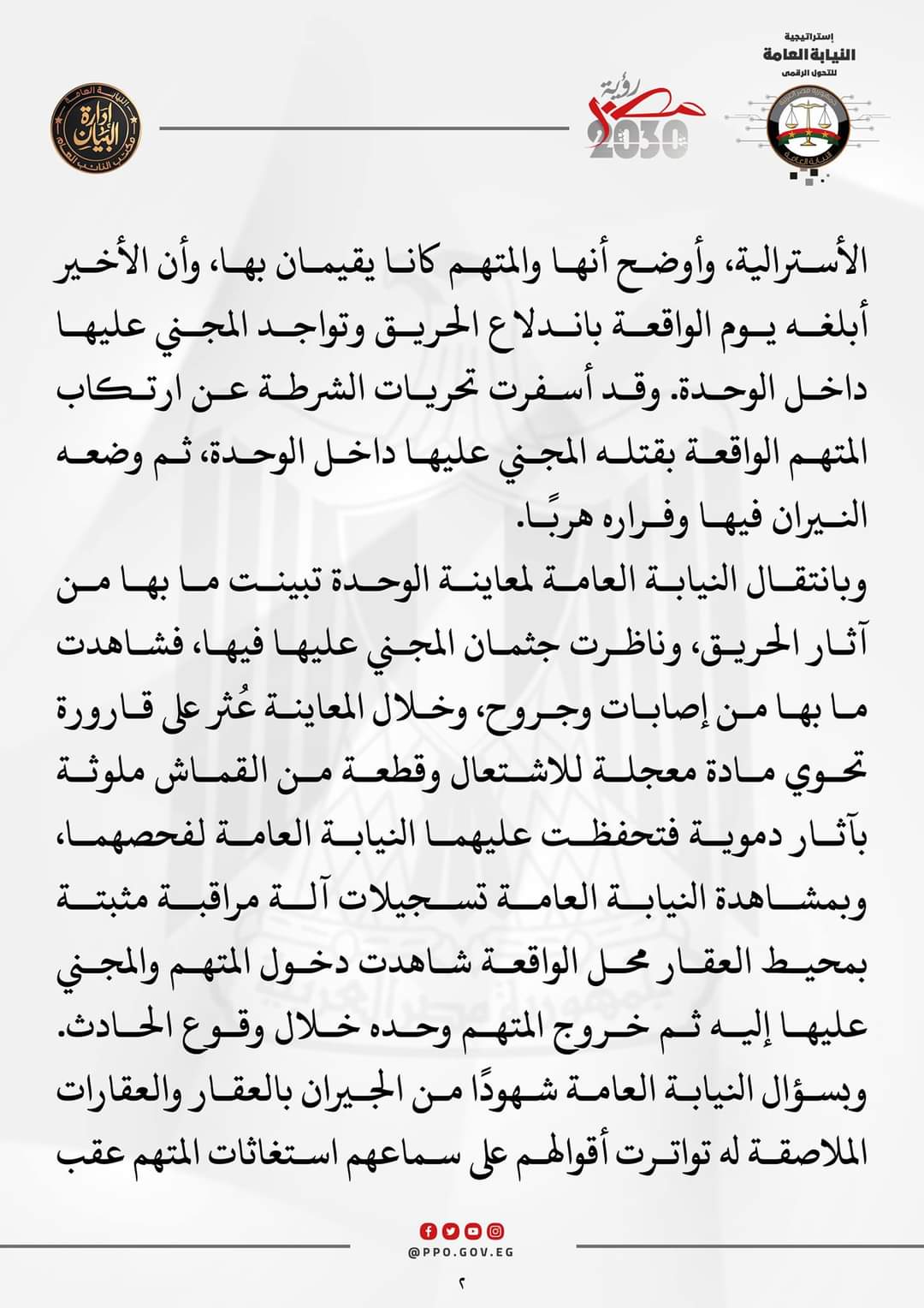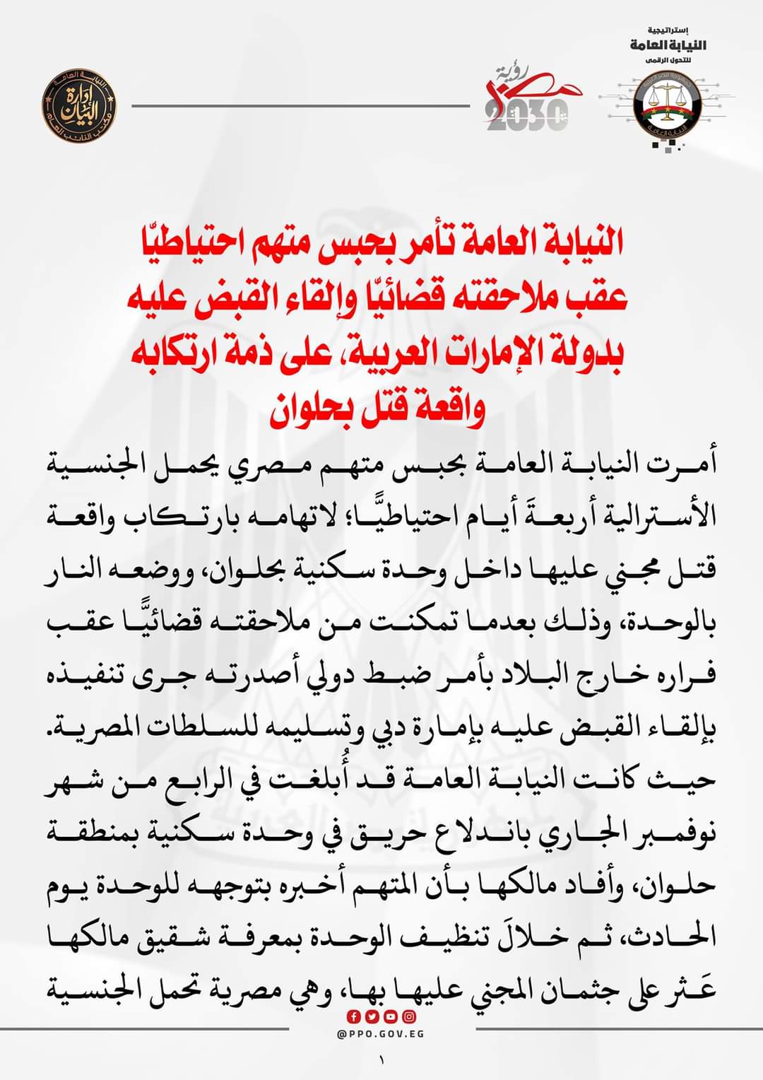 عقب انتهاء التحقيقات، أصدرت النيابة العامة بيانا بكافة تفاصيل الواقعة، تضمن حبس المتهم مصري يحمل الجنسية الأسترالية أربعةَ أيام احتياطيًّا؛ لاتهامه بارتكاب واقعة قتل مجني عليها داخل وحدة سكنية بحلوان، واشعال النار بالوحدة، وذلك بعدما تمكنت من ملاحقته قضائيًّا عقب فراره خارج البلاد بأمر ضبط دولي، جرى تنفيذه بإلقاء القبض عليه بإمارة دبي، وتسليمه للسلطات المصرية.