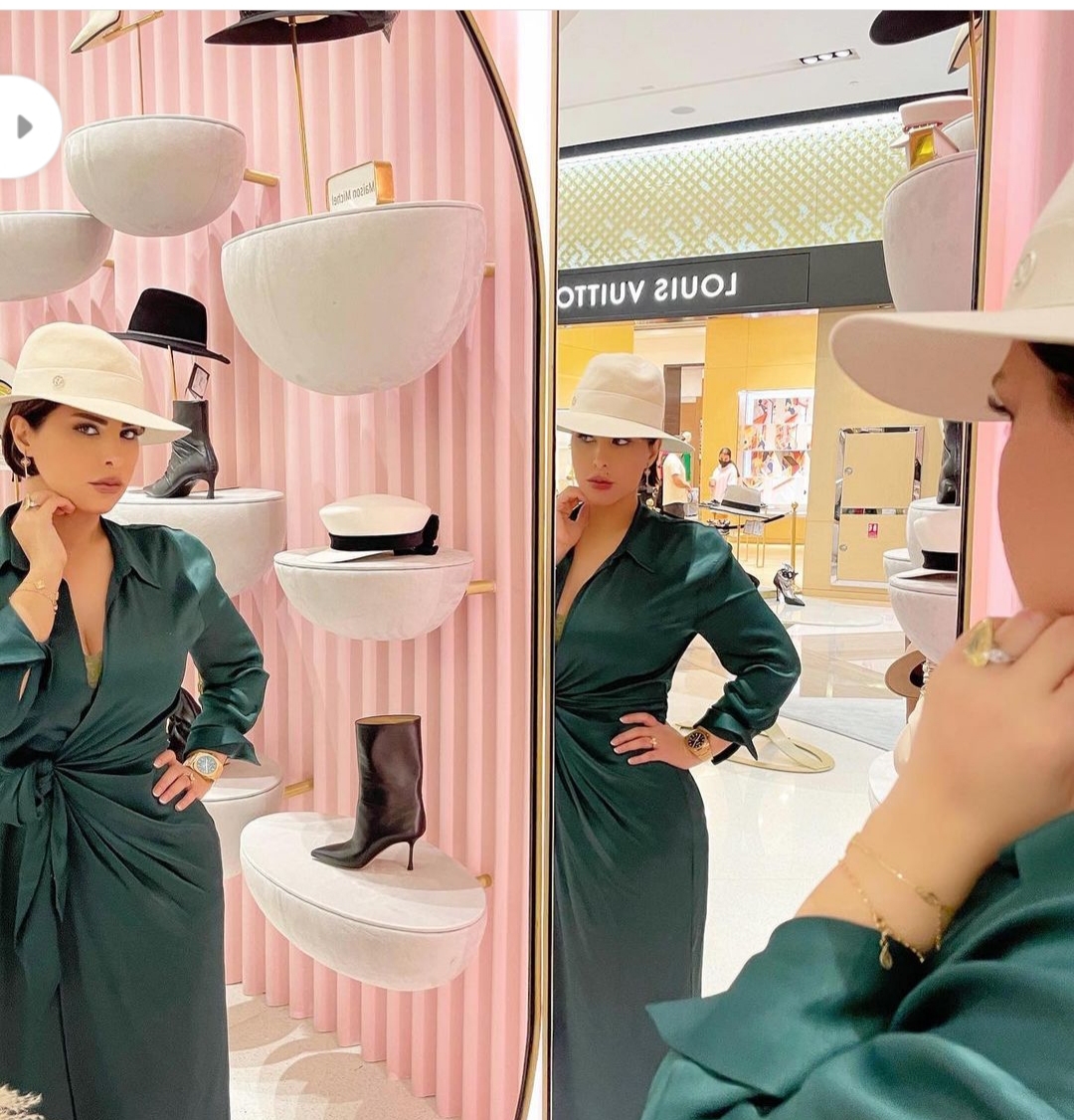 تألقتشمس الكويتية، بفستان طويل باللون الأخضر من للحرير الناعم وبتصميم ملفوف حول الخصر وأكمام طويلة واختارت ارتداء قبعة من الخوص باللون البيج الفاتح على رأسها، وهو ما أبرز رقة وجمال إطلالتها.