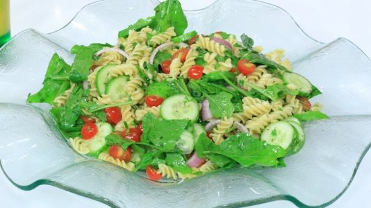 في وعاء خلط على نار خفيفة تطهي صدور الدجاج في ماء في مقلاة لمدة 8 دقائق. يُرفع الدجاج عن المقلاة ويُطهى 200 جم من المكرونة في مرقة الدجاج لمدة 11 دقيقة.