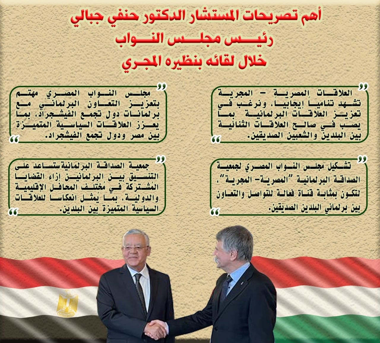1- العلاقات المصرية – المجرية تشهد تنامياً إيجابياً، ونرغب في تعزيز العلاقات البرلمانية بما يصب في صالح العلاقات الثنائية بين البلدين والشعبين الصديقين.