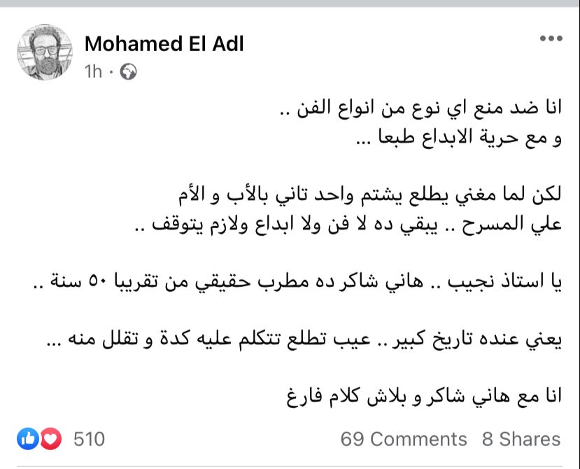 وجه المخرج ماندو العدل، رسالة لرجل الأعمال نجيب ساويرس عبر حسابه بالفيسبوك على خلفية الأزمة مع نقيب المهن الموسيقية الفنان هانى شاكر.