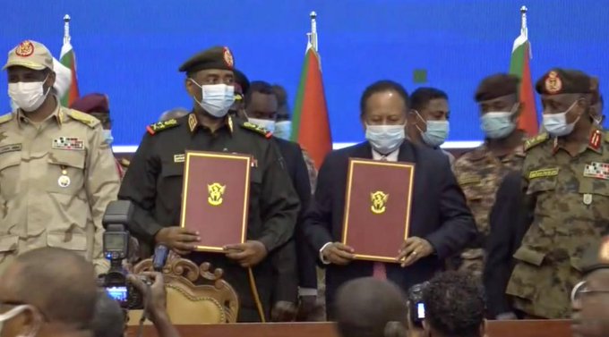 وكان حمدوك وقائد الجيش ورئيس المجلس السيادي عبد الفتاح البرهان، قد وقعا اتفاقاً سياسياً في وقت سابق الأحد، أعيد بموجبه حمدوك إلى منصبه رئيساً لمجلس الوزراء. وجرت مراسم التوقيع في القصر الرئاسي بالخرطوم.
