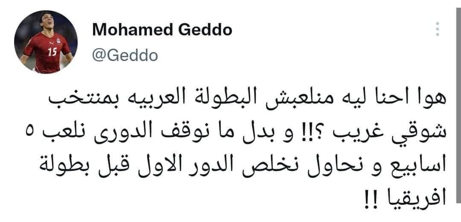 هو احنا ليه منلعبش البطولة العربية بمنتخب شوقي غريب ؟! وبدل ما توقف الدورى نلعب ٥ اسابيع ونحاول نخلص الدور الاول قبل بطولة إفريقيا.