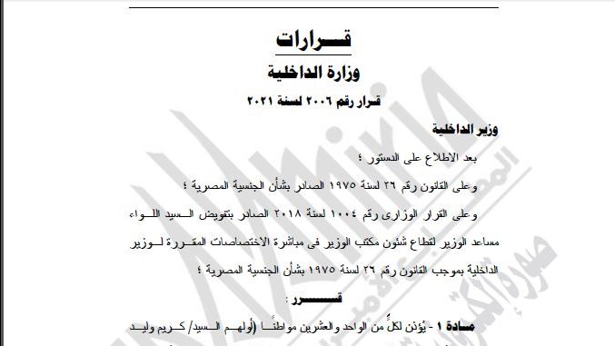 وجاء قرار وزير الداخلية رقم2006 لسنة 2021 بعد الإطلاع على الدستور وعلى القانون رقم 26 لسنة 1975 الصادر بشأن الجنسية المصرية، وعلى القرار الوزاري رقم 1004 لسنة 2018.