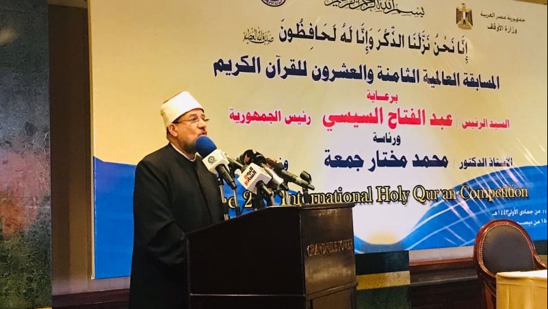 قال الدكتورالدكتور محمد مختار جمعة وزير الأوقاف، إن يومنا هذا من أيام الله (عز وجل) ؛ فهو يوم لأهل القرآن الكريم الذين هم أهل الله (عز وجل) وخاصته ، موجهًا الشكر للسيد الرئيس/ عبد الفتاح السيسي (حفظه الله) على تفضله برعاية هذه المسابقة إكرامًا لأهل القرآن الكريم ، موضحًا حرص سيادته على تشجيع حفظ القرآن الكريم وفهم معانيه وإكرام أهله، وهو ما تقوم به وزارة الأوقاف في مسابقاتها العالمية ، حيث تم إضافة فهم المقاصد إلى أفرع المسابقة.