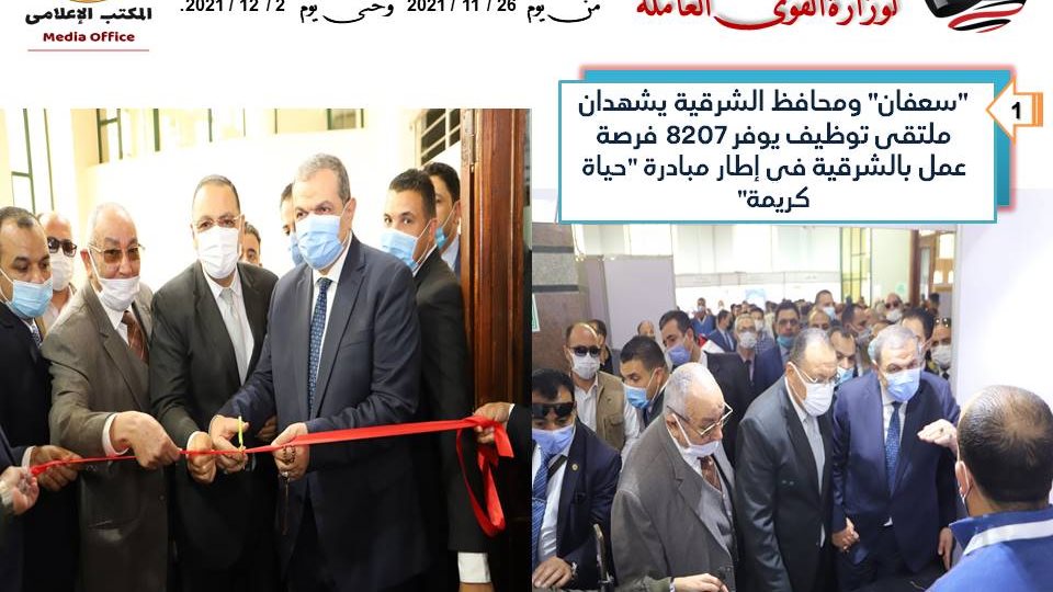 وفيما يلي تفاصيل ما جاء بالحصاد الأسبوعي، حيث شهد محمد سعفان وزير القوى العاملة ، ومحافظ الشرقية الدكتور ممدوح غراب، فعاليات ملتقى التوظيف بمعاهد العبور بمحافظة الشرقية ، والذي يوفر 8258 فرصة عمل للذكور والإناث لمختلف المؤهلات ، فضلًا عن المهن الفنية من جميع التخصصات والقطاعات الوظيفية المختلفة، وفرتها 42 شركة بالمحافظة ، من شركات العاشر من رمضان وبلبيس، بمرتبات مجزية، بحضور الدكتور عبد الله الدهشان رئيس مجلس إدارة معاهد العبور، وأحمد عبد الهادي وكيل مديرية القوى العاملة بالمحافظة.