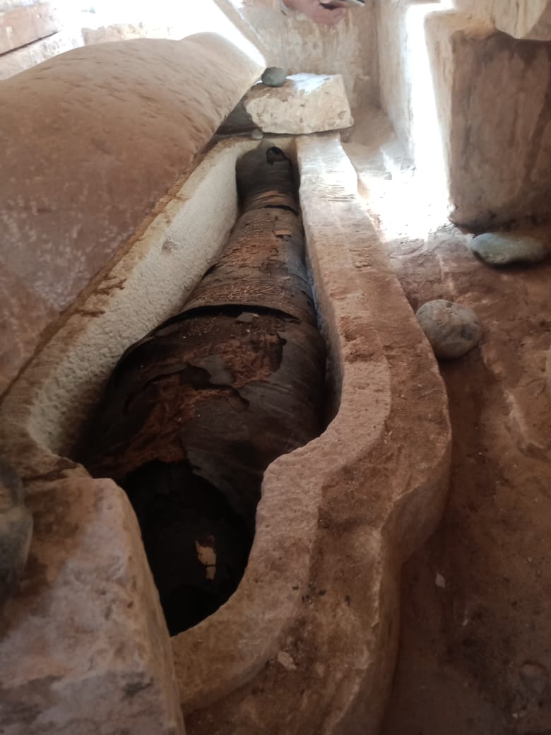 وقال الدكتور مصطفى وزيري الأمين العام للمجلس الأعلى للآثار، أن البعثة عثرت عند أحد هاتين المقبرتين على بقايا رفات لشخصين مجهولين ذو فم به لسان من الذهب، أما داخل المقبرة تم العثور على تابوت مصنوع من الحجر الجيري له غطاء على هيئة سيدة؛ وبجانبه بقايا رفات لشخص غير معروف بعد.