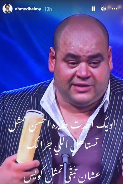 حيث نشر أحمد حلمى صور لـ محمد ممدوح عبر خاصية الاستورى ضمن مقع إنستجرام ، وعلق قائلاً: "مبروك يا أجمد ممثل، أديك أخدت جائزة أحسن ممثل تستأهل اللى جرالك عشان تبقى تمثل كويس".