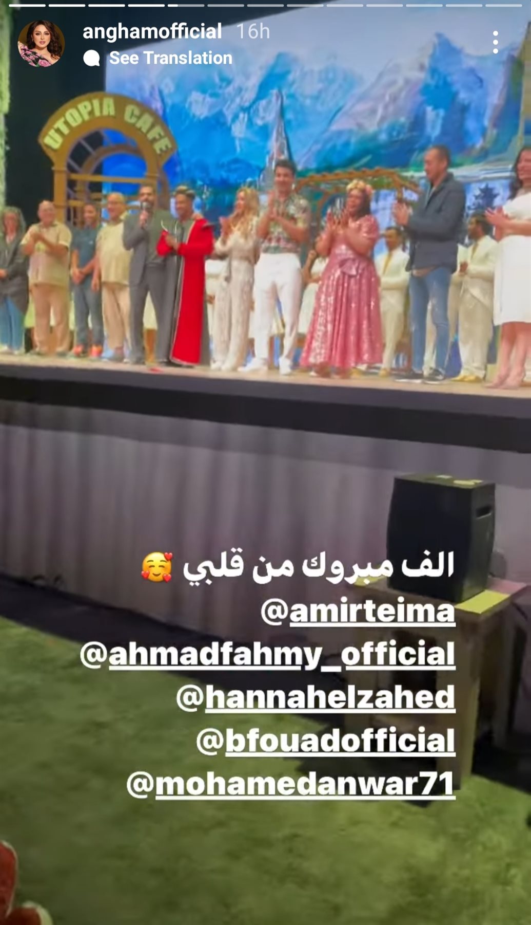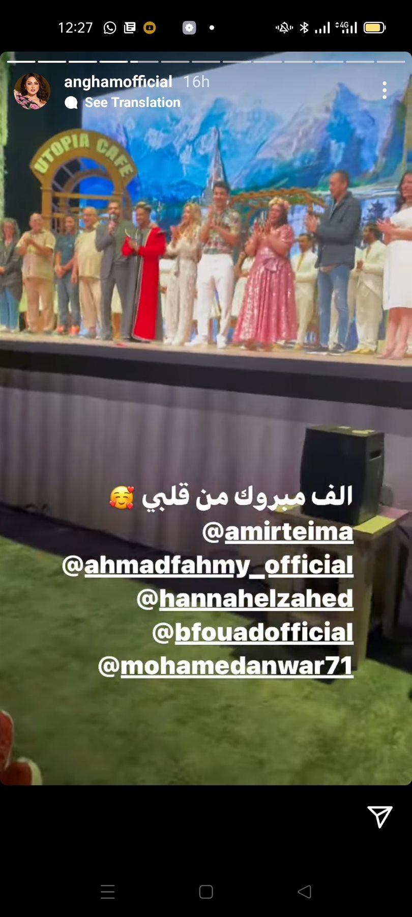 وعلقت أنغام قائلة:" مبروك يا أمير طعيمة مسرحية جوازة معفرتة حقيقى ضحكت من قلبى، وألف مبروك من قلبى لهنا الزاهد و أحمد فهمى و بيومى فؤاد و محمد أنور".