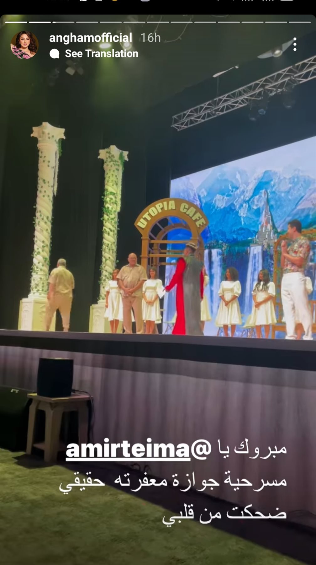 حرصت الفنانة أنغام علي حضور مسرحية جوازة معفرتة ، والتي تعرض ضمن فاعليات موسم الرياض ، حيث نشرت عدد من الصور عبر خاصه الاستورى لصفحتها الرسمية علي موقع الفيديوهات الشهير " انستجرام "
