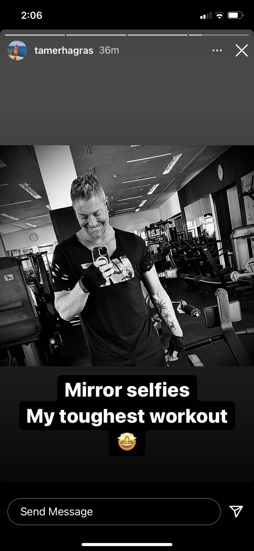 وظهر تامر هجرس ، بصورة سيلفي و هو يستعرض عضلاته من الجيم، مما أثار إعجاب متابعيه.