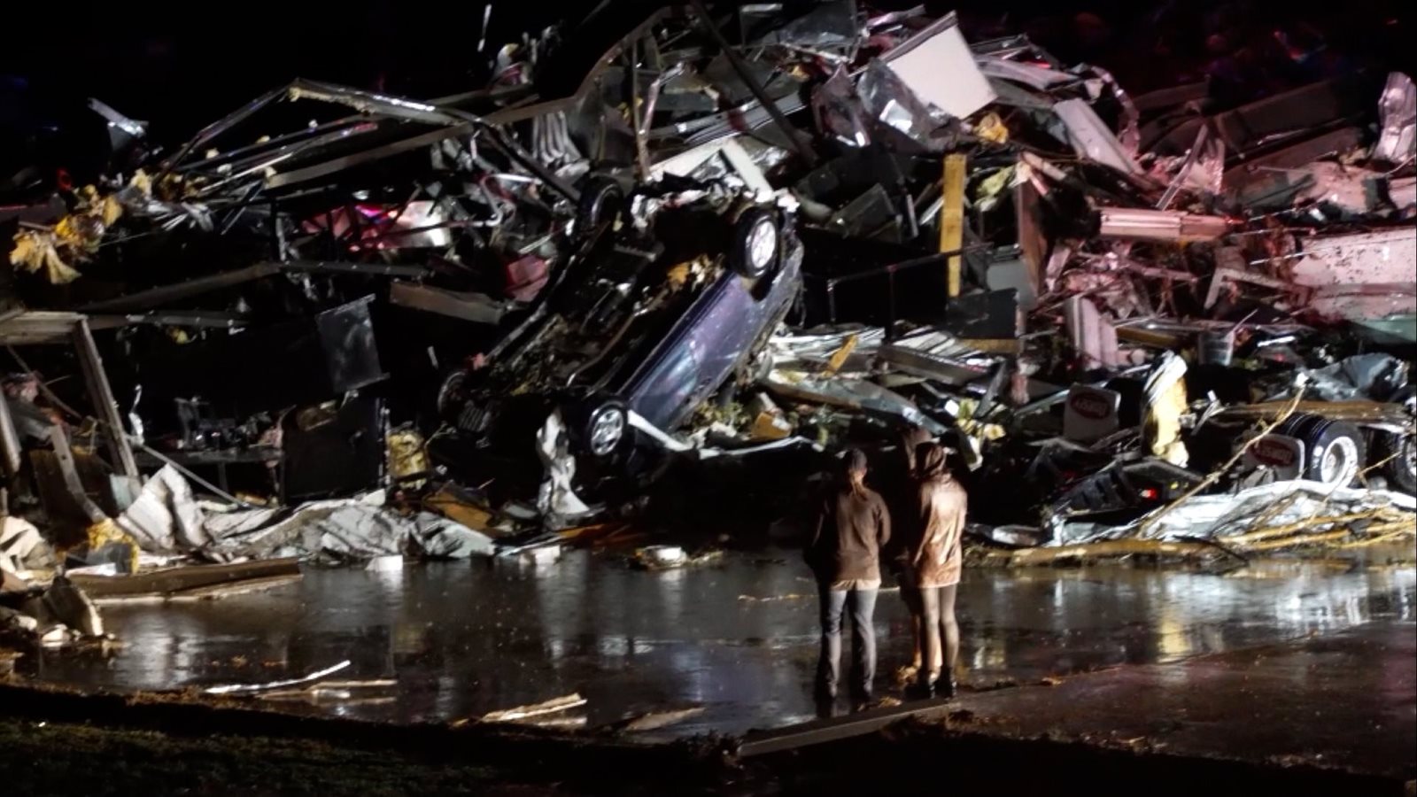 وأظهر مقطع فيديو من مايفيلد ما تبقلى من المصنع هناك، حيث حقل ضخم من الحطام، معظمه المعدن الملتوي، بارتفاع عدة أقدام، ورجال إنقاذ يستخدمون أيديهم وآلات الحفر.