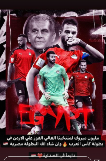 ونشر حمو بيكا صورة لمنتخب مصر عبر خاصيه “الاستوري”، وعلق عليها كاتبًا: “مليون مبروك منتخبنا الغالي الفوز علي الأردن في بطولة كأس العرب، وان شاء الله البطولة مصرية، دايمًا في الصدارة”.