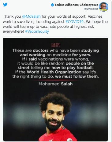 ونشر المدير العالم لمنظمة الصحة العالمية تغريدة عبر حسابه الشخصي على موقع التواصل الاجتماعي «تويتر» قال فيها: " شكرًا محمد صلاح على دعمك، اللقاحات المضادة لفيروس كورونا تساعد في إنقاذ الأرواح، ونأمل أن يتعاون العالم معًا لتطعيم الأفراد الأكثر عرضة للخطر في كل مكان".