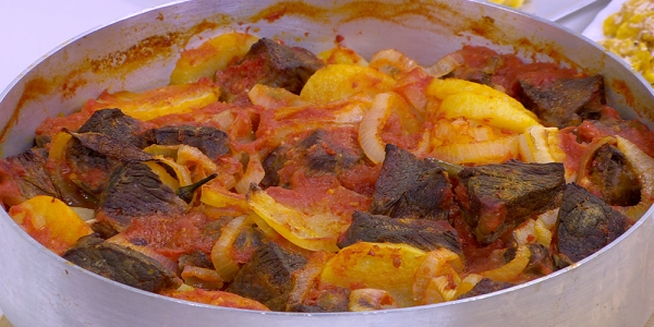 3- تقلب الزيت تدريجيا على البطاطس مع التقليب، ثم يوضع البصل الأخضر و الصوص الحار.