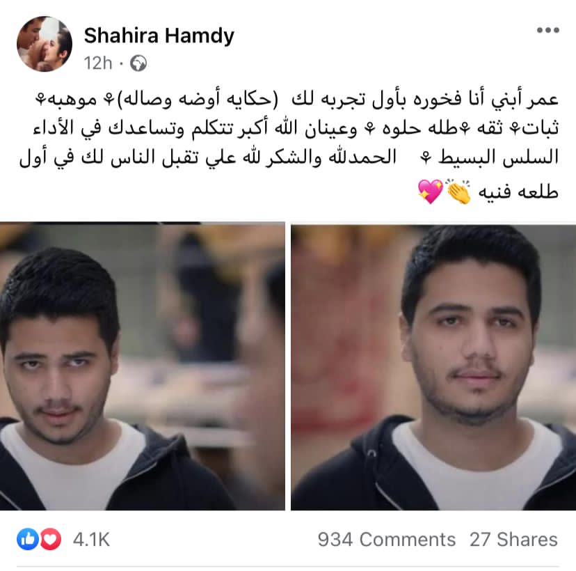وكتبت شهيرة عبر حسابها بالفيسبوك :" عمر أبني أنا فخورة بأول تجربة لك (حكاية أوضة وصالة) موهبه و ثبات و ثقه وطله حلوه وعينان الله أكبر تتكلم وتساعدك في الأداء السلس البسيط ".