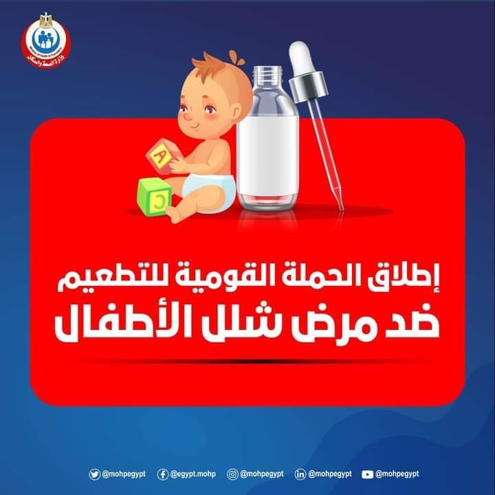 تستعد وزارة الصحة والسكان ، لإطلاق حملة شلل الأطفال من عمر يوم حتي 5 سنوات ، للمصريين والمقيمين في مصر خلال إطلاق الحملة ، وذلك خلال الفترة من 19 ديسمبر 2021 ولمدة 4 أيام، وذلك لرفع المناعة المجتمعية لدى جميع الأطفال من عمر يوم حتى خمس سنوات.