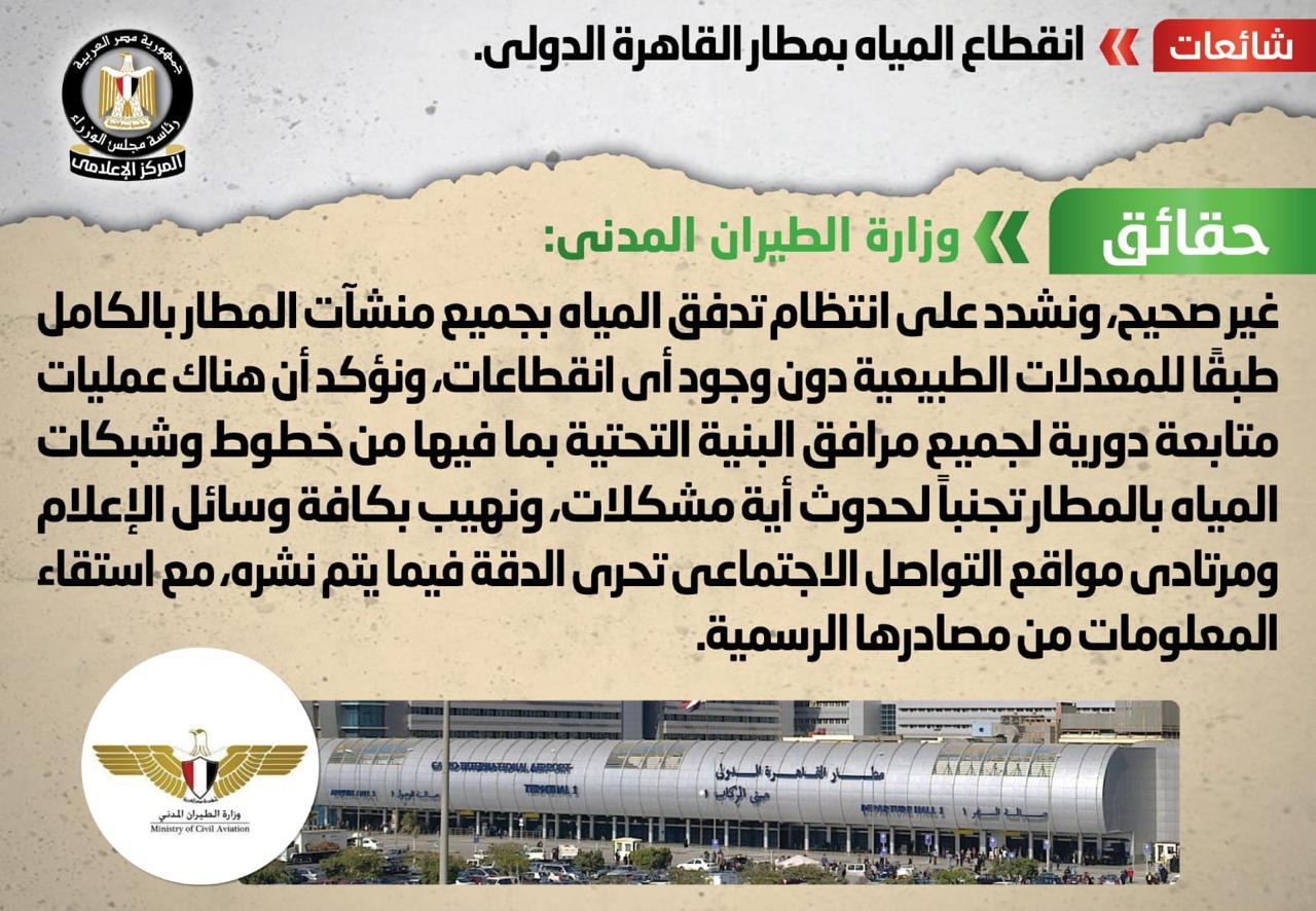 و قام المركز الإعلامي لمجلس الوزراء بالتواصل مع وزارة الطيران المدني، التي نفت هذه الأنباء، مُؤكدةً أنه لا صحة لانقطاع المياه بمطار القاهرة الدولي، مُشددةً على انتظام تدفق المياه بجميع منشآت المطار بالكامل طبقًا للمعدلات الطبيعية، دون وجود أي انقطاعات.