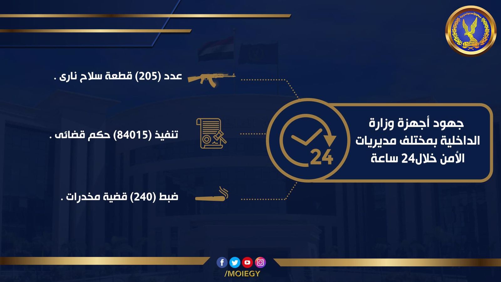 كما واصلت أجهزة وزارة الداخلية حملاتها الأمنية الموسعة بجميع مديريات الأمن وتمكنت خلال 24 ساعة من ضبط 205 قطعة سلاح نارى ، و240 قضية مخدرات وتنفيذ 84015 حكم قضائى متنوع، وأيضا ضبط تشكيل عصابى ، ضم عنصرين، إرتكبا 6 حوادث متنوعة.