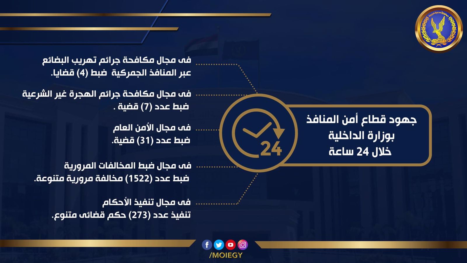 ونجح قطاع أمن المنافذ بوزارة الداخلية خلال 24 ساعة فى مواجهة جرائم التهريب ومخالفات الإجراءات الجمركية بشتى صورها، في ضبط 4 قضايا تهريب البضائع عبر المنافذ الجمركية، و31 قضية في مجال الأمن العام.