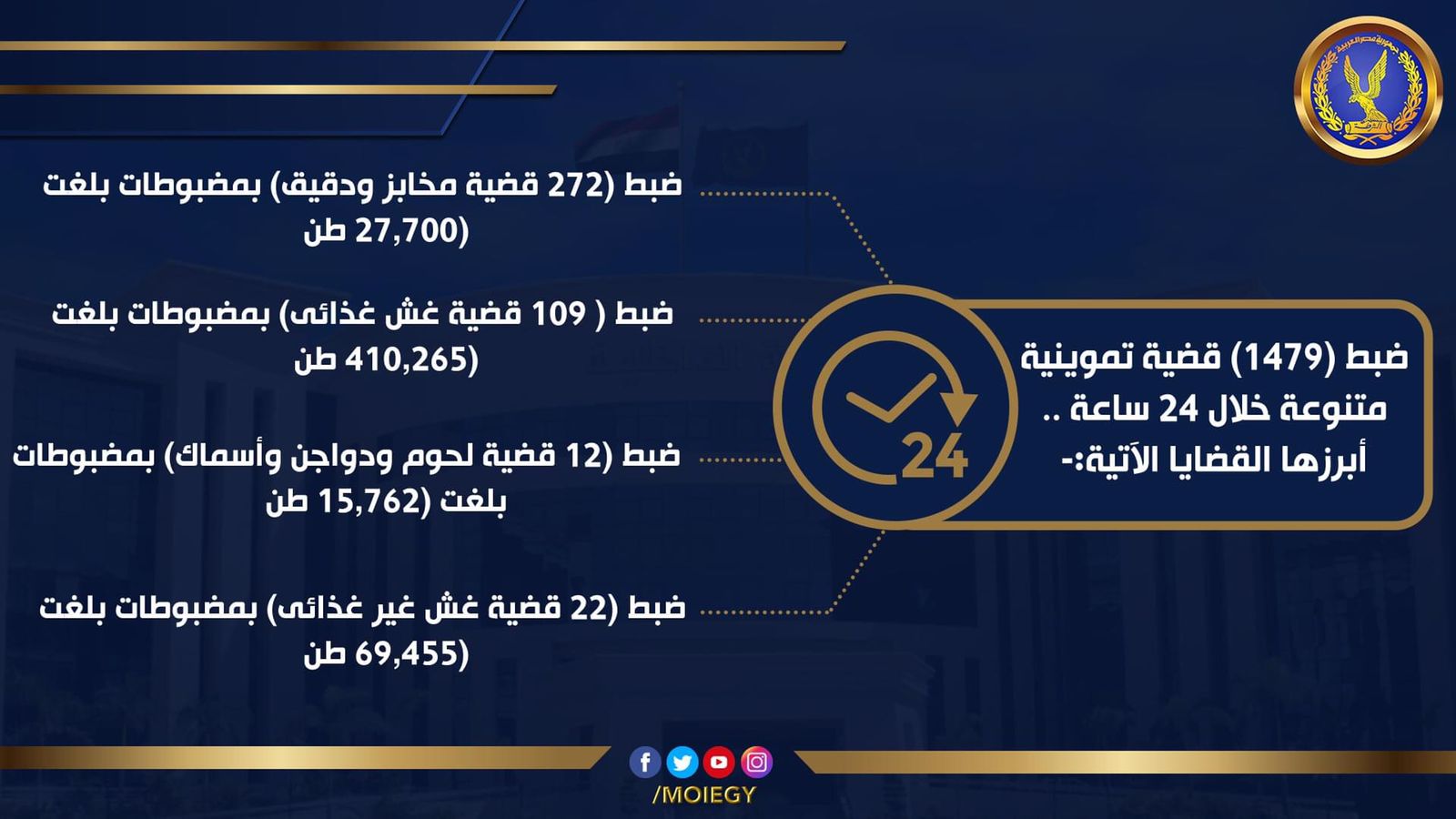 وأسفرت جهود وزارة الداخلية، فى مجال متابعتها للأسواق عن ضبط 1423 قضية تموينية متنوعة أبرزها (غش غذائى، لحوم ومصنعاتها، مواد بترولية).