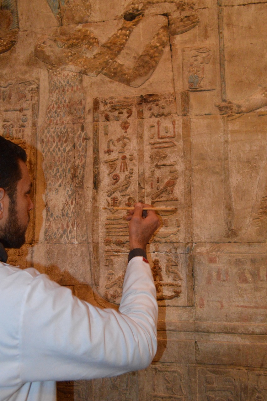 و تابع وزيرى ، أعمال الحماية والتنظيف، ورفع " السناج " وعوامل التعرية من فوق النقوش والرسوم والألوان، بالصالة الثانية والغرف الداخلية لاستعادة بريقها القديم، وهي الأعمال التي ينفذها ، مرممين وأثريين مصريين، وذلك على غرار الأعمال الجارية بمعابد الكرنك والأقصر.