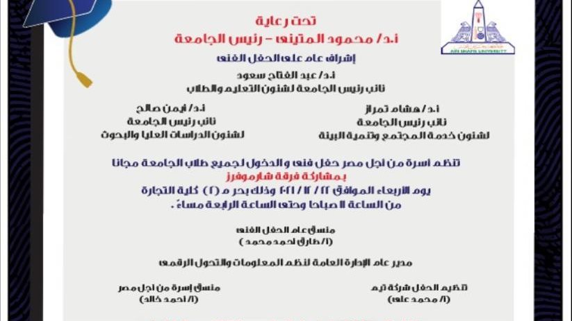 الجدير بالذكر نظمت أمس أسرة من أجل مصر المركزية الحفل الثالث على التوالي لفريق شارموفرز بجامعة عين شمس.