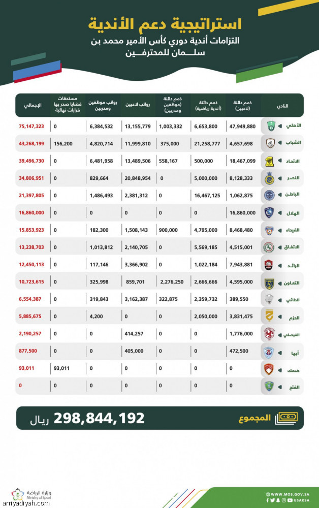 وحددت الـ26 يناير 2022، آخر موعد للسدادا، فيما بلغت قيمة الالتزامات المالية على لأندية المحترفين قرابة الـ300 مليون ريال.