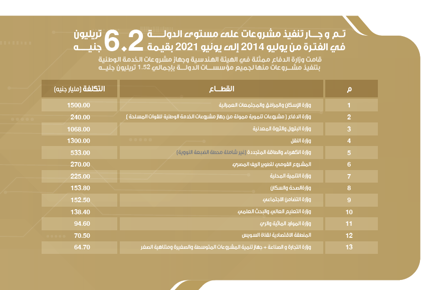 مشروعات بقيمة 1500 مليار جنيه لصالح وزارة الإسكان والمرافق والمجتماعات العمرانية
