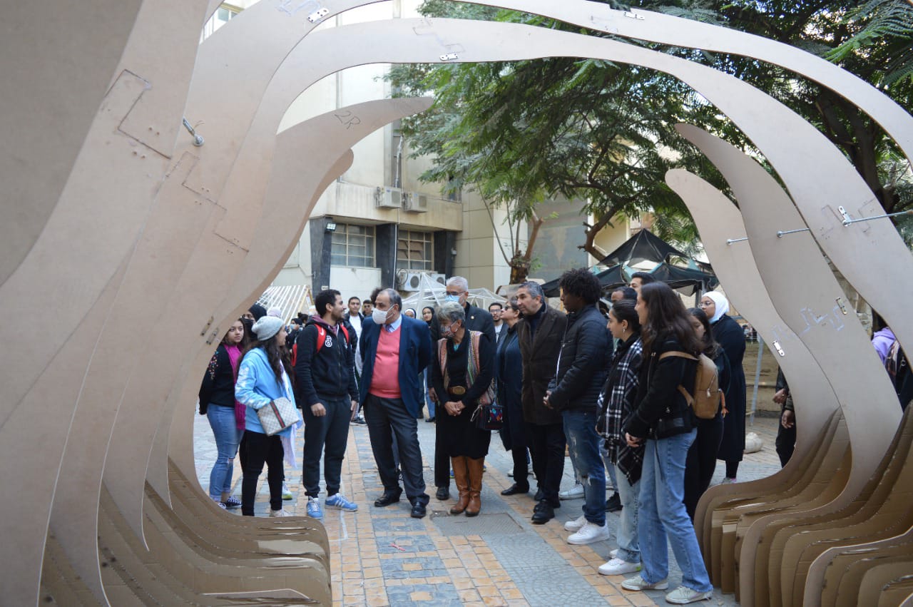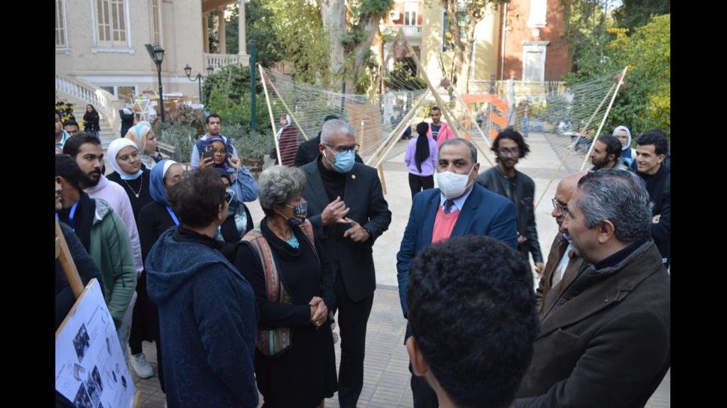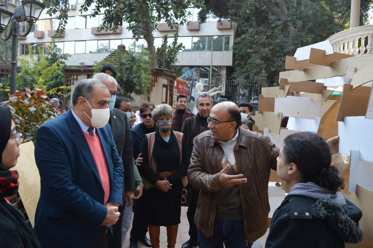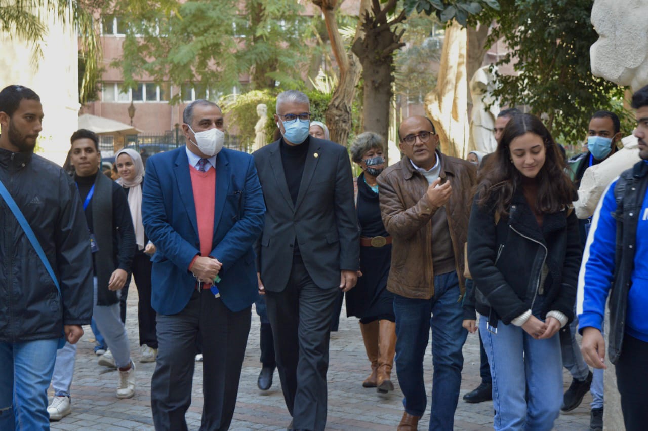وجاءت الجولة بمرافقة الدكتور عمرو سامي عميد الكلية، و الدكتورة أمنية يحيى وكيل الكلية لشئون خدمة المجتمع وتنمية البيئة، و الدكتور ياسر السيد أستاذ مادة تنفيذ وماكيت بقسم العمارة و المشرف على الأعمال الفنية للطلاب، و الدكتورة أمال عبده الأستاذ المتفرغ بقسم العمارة، و الدكتور أحمد حسني رضوان.
