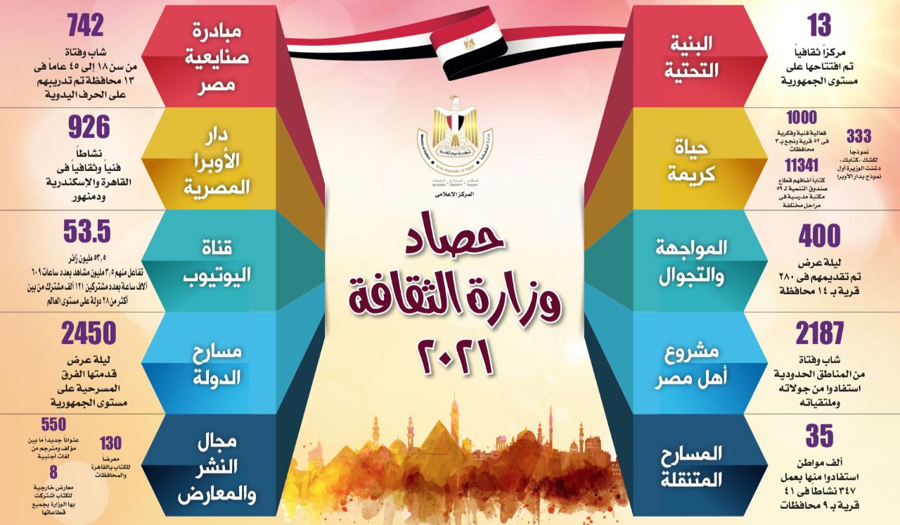 استعادت وزارة الثقافة عافيتها خلال 2021، واستمرت فى تنفيذ محاور استراتيجية عملها مواصلة نشر ألوان الابداع بين جموع المصريين فى مختلف ربوع الوطن تحقيقا للعدالة الثقافية.