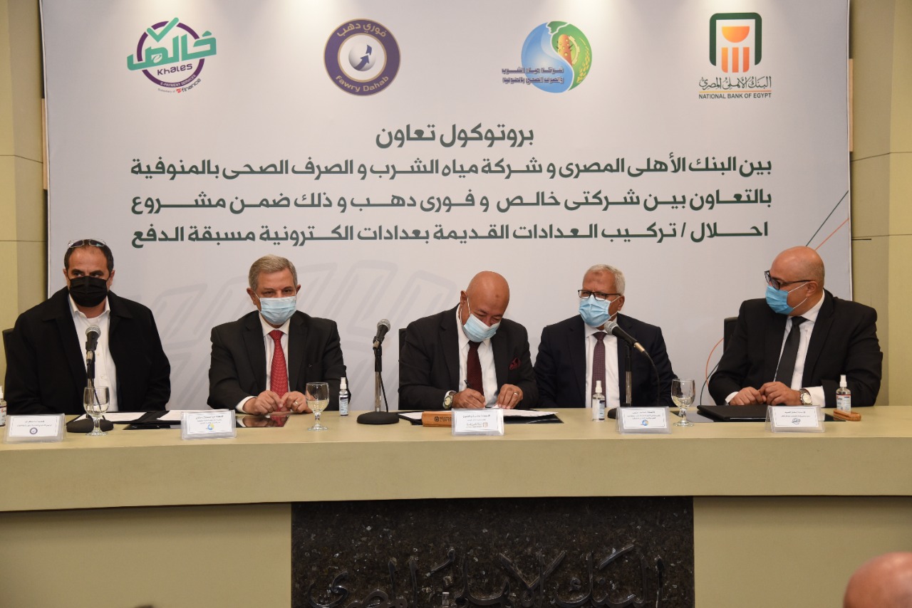 ووقع بروتوكول التعاون، يحيى أبو الفتوح نائب رئيس مجلس إدارة البنك الأهلي المصري والمهندس محمد نجيب رئيس شركة مياه الشرب والصرف الصحى بالمنوفية، وحسام عز الرئيس التنفيذى للقطاع التجارى لشركة فورى، ومعتز السيد عضو مجلس الإدارة المنتدب لشركة خالص.