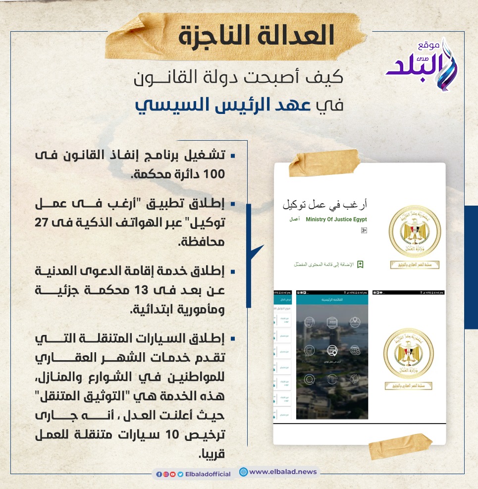 وأشارت وزارة العدل إلى أنه تم إطلاق خدمة اقامة الدعوى المدنية عن بعد فى 13 محكمة جزئية ومأمورية ابتدائية من إجمالى 15 محكمة ابتدائية، كما تم تشغيل برنامج إنفاذ القانون فى 100 دائرة محكمة، كما تم إطلاق تطبيق "أرغب فى عمل توكيل" عبر الهواتف الذكية فى 27 محافظة.