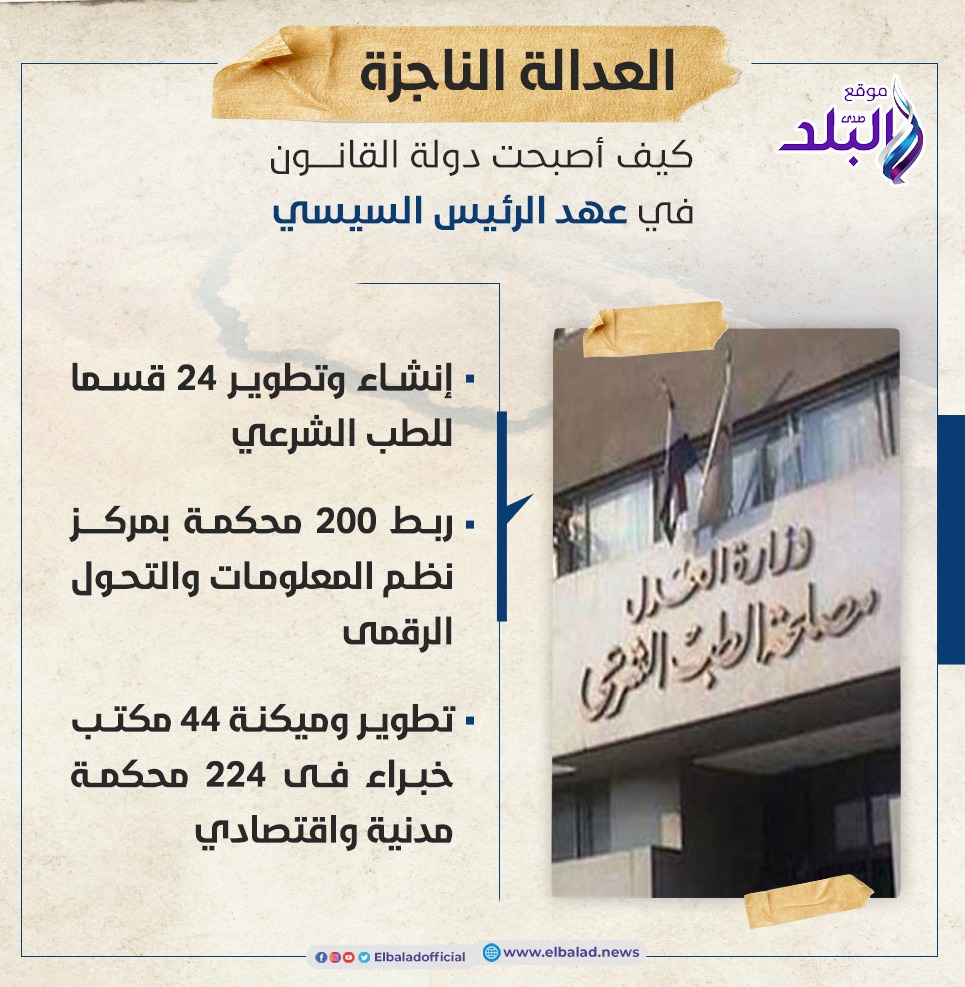 وتضمن مشروع العدالة إنشاء وتطوير 24 قسما للطب الشرعي وتطوير وميكنة 44 مكتب خبراء فى 224 محكمة مدنية واقتصادية على مستوى الجمهورية،كما تم ربط 200 محكمة بمركز نظم المعلومات والتحول الرقمى .