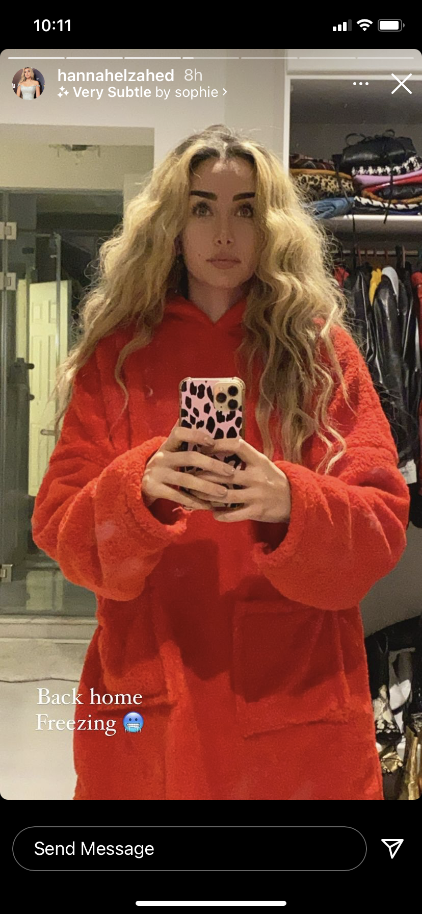 وظهرت الزاهد من داخل غرفة ملابسها مرتدية ملابس شتوية و علقت قائلة:" رجعت للبيت و بتجمد "