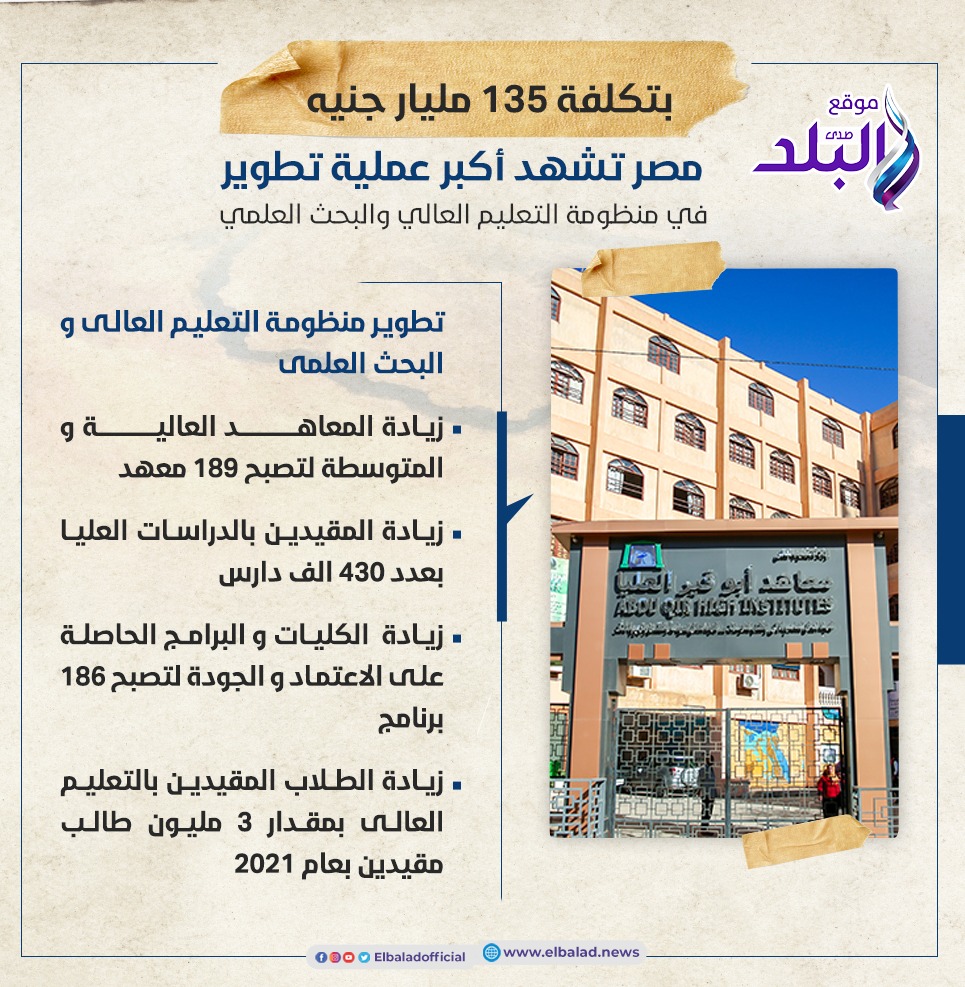- زيادة الطلاب المقيدين بالتعليم العالى بنسبة 30.4% بمقدار 3 مليون طالب مقيدين بعام 2021 ، بعدما كانو 2.3 مليون