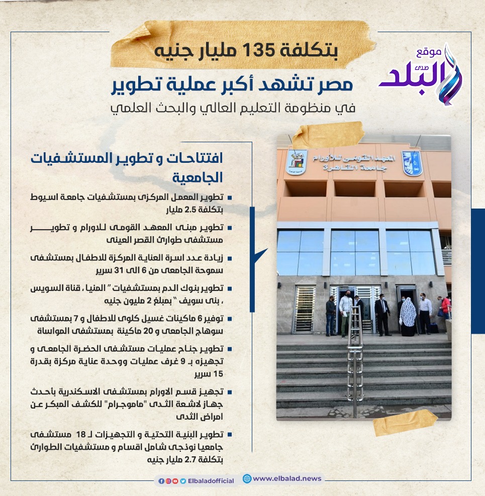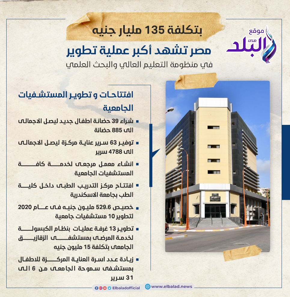تطوير البنية التحتية و التجهيزات لعدد 18 مستشفى جامعيا نموذجي شامل اقسام و مستشفيات الطوارئ بتكلفة 2.7 مليار جنيه