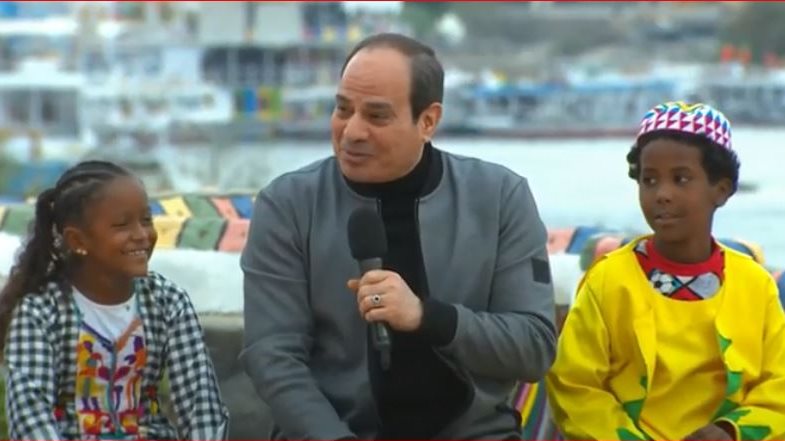 وكان أهالي قرية غرب سهيل، استقبلوا الرئيس السيسي بالزغاريد، ونظم عدد من الأطفال أغنية باللهجة النوبية خاصة للرئيس السيسي للترحيب به، وطلب منهم الرئيس تعليمه الكلمات وترديدها معهم قبل أن يلتقط صورة تذكارية معهم.