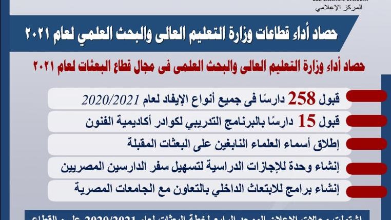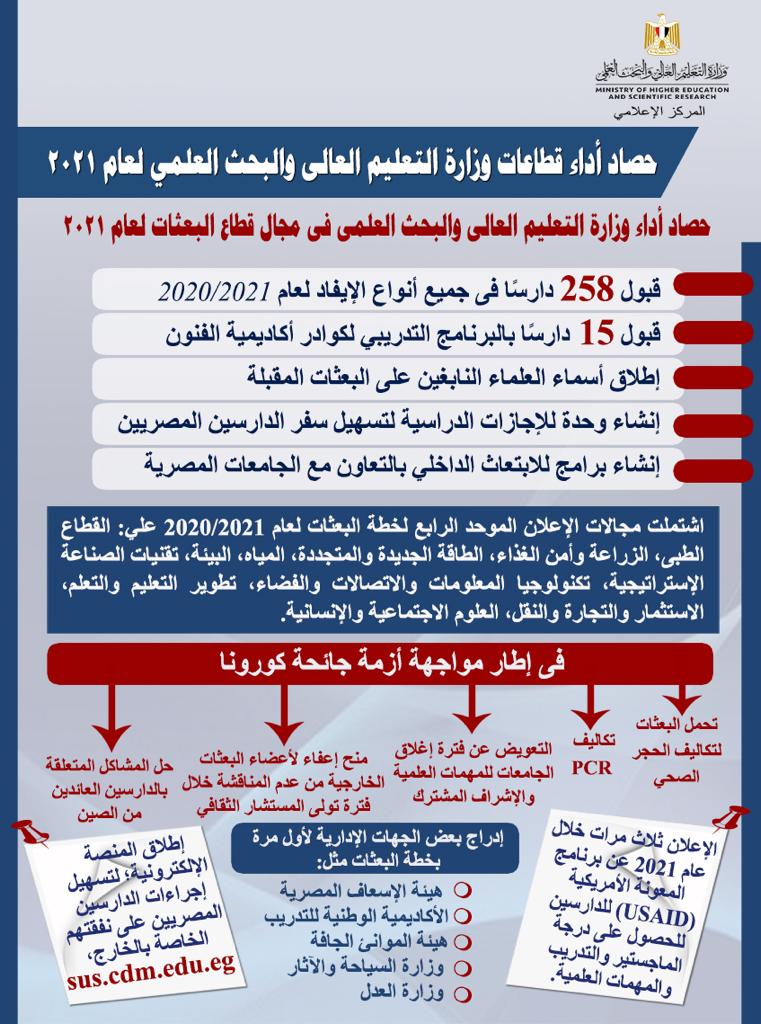 ونوه إلى تطور خطة البعثات السنوية، حيث تمت الموافقة على إنشاء برامج للابتعاث الداخلي بالتعاون مع الجامعات المصرية فى مجالات البرامج الدولية المتميزة، واعتماد نتيجة الإعلان الموحد الرابع عن خطة البعثات 2020/2021 من الخطة الخمسية الثامنة 2017/2022، فضلاً عن اعتماد نتيجة إعلان خطة البعثات الرابع 2020/2021 (الجزء الثاني) من الخطة الخمسية الثامنة 2017-2022، إضافة إلى الإعلان عن الجزء الأول من خطة العام الخامس 2021/2022 من الخطة الخمسية الثامنة 2017/2022.