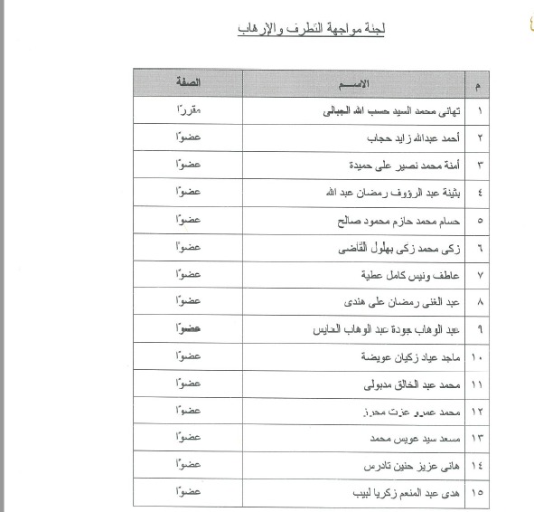 أعلنت الدكتورة إيناس عبد الدايم، وزيرةالثقافة، قرارًا بتشكيل لجنة مواجهة التطرف والإرهاب،في المجلس الأعلى للثقافة، لمدة عامين، وجاءت اللجنة برئاسة تهائي محمد السيد حسب الله الجاليمقررًا، وضمت اللجنة فى عضويتها كلا من: