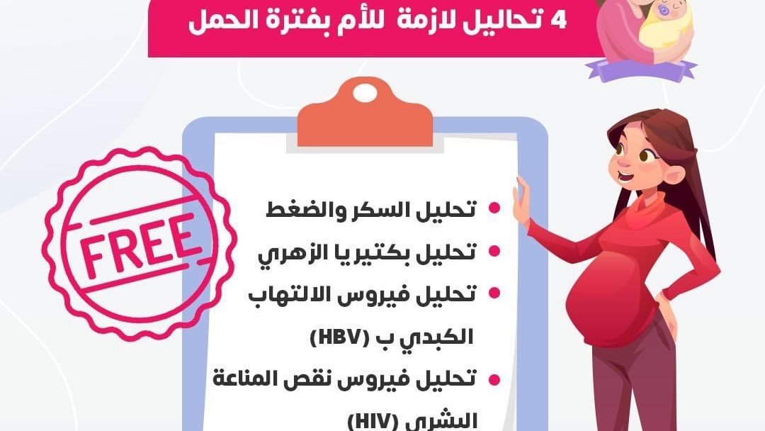 • يتم إجراء الفحص الإكلينيكي لتقييم الحالة العامة للحامل والجنين ضمن المبادرة، ويتم إجراء التحاليل اللازمة للأم للكشف عن الإصابة بالأنيميا، وتحديد احتياج الأم للحصول على حقنة Anti-D بعد الولادة من عدمه، فضلاً عن تحليل البول الكامل لاكتشاف الزلال.