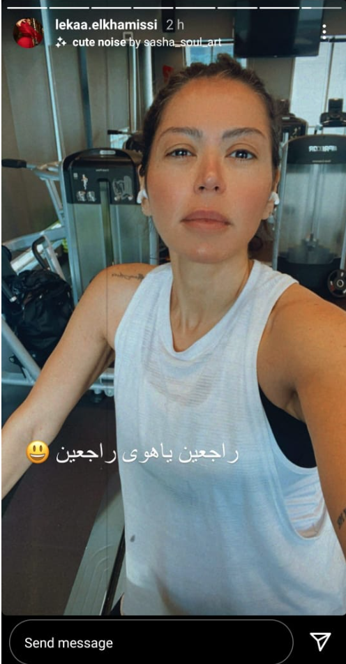 وظهرت لقاء الخميسي صورة مستعرضة لياقتها من الجيم بملابس رياضية، معلقة “راجعين يا هوي راجعين”.