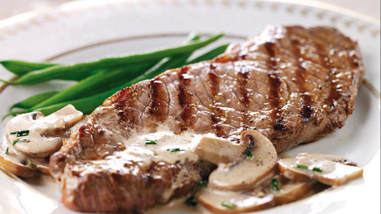 6- ضعي شرائح اللحمة في طبق التقديم وافردي عليها الصوص بالمشروم .. زينيها بالبقدونس