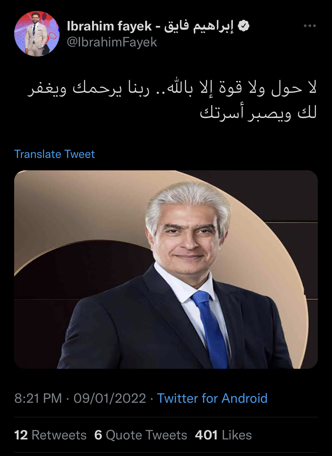 نعي الإعلامي إبراهيم فايق، الإعلامي وائل الإبراشي، عبر حسابه الشخصي بموقع التواصل الاجتماعي “تويتر”.